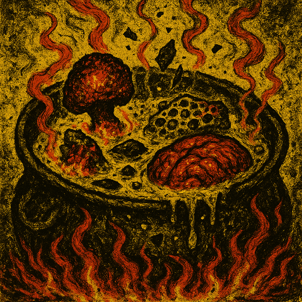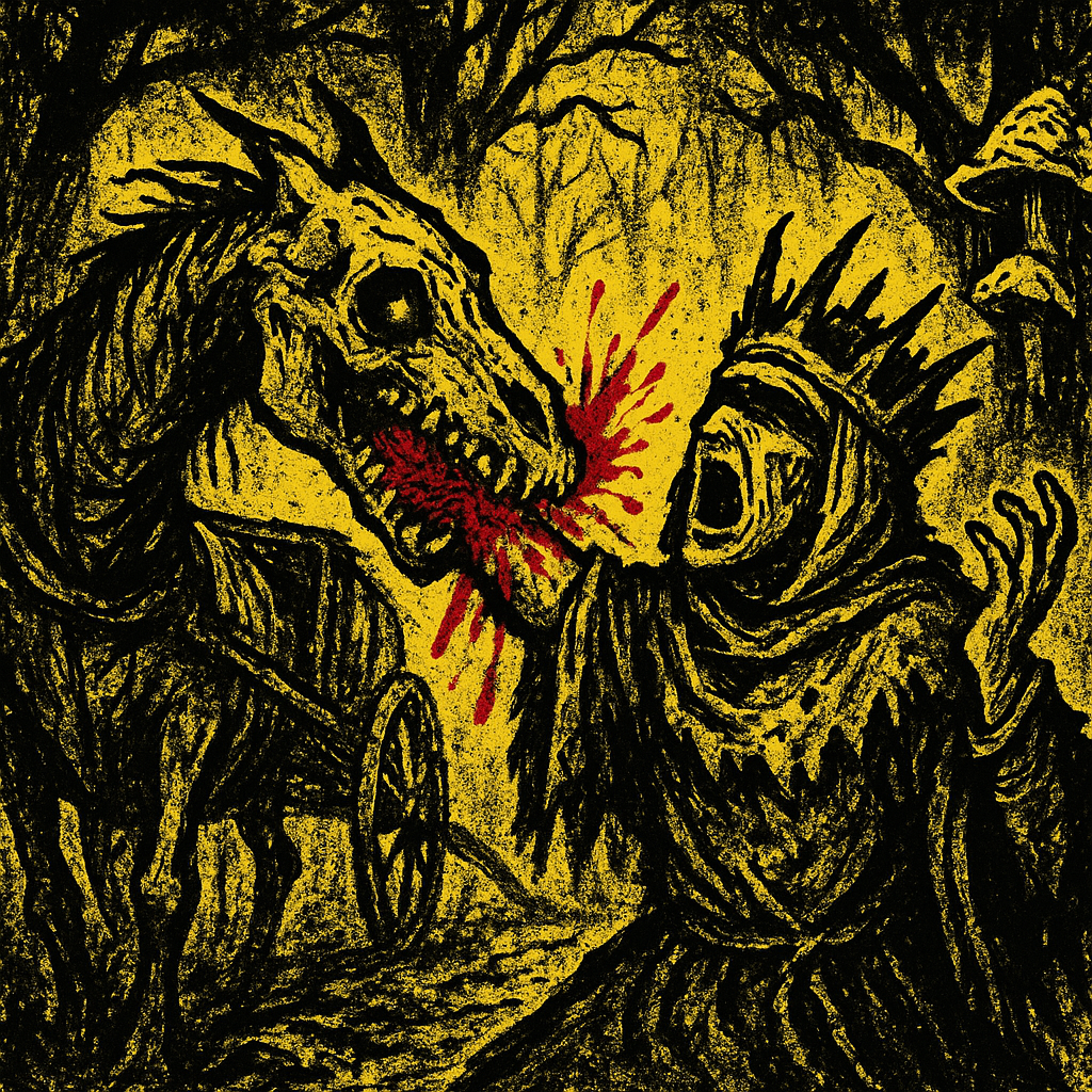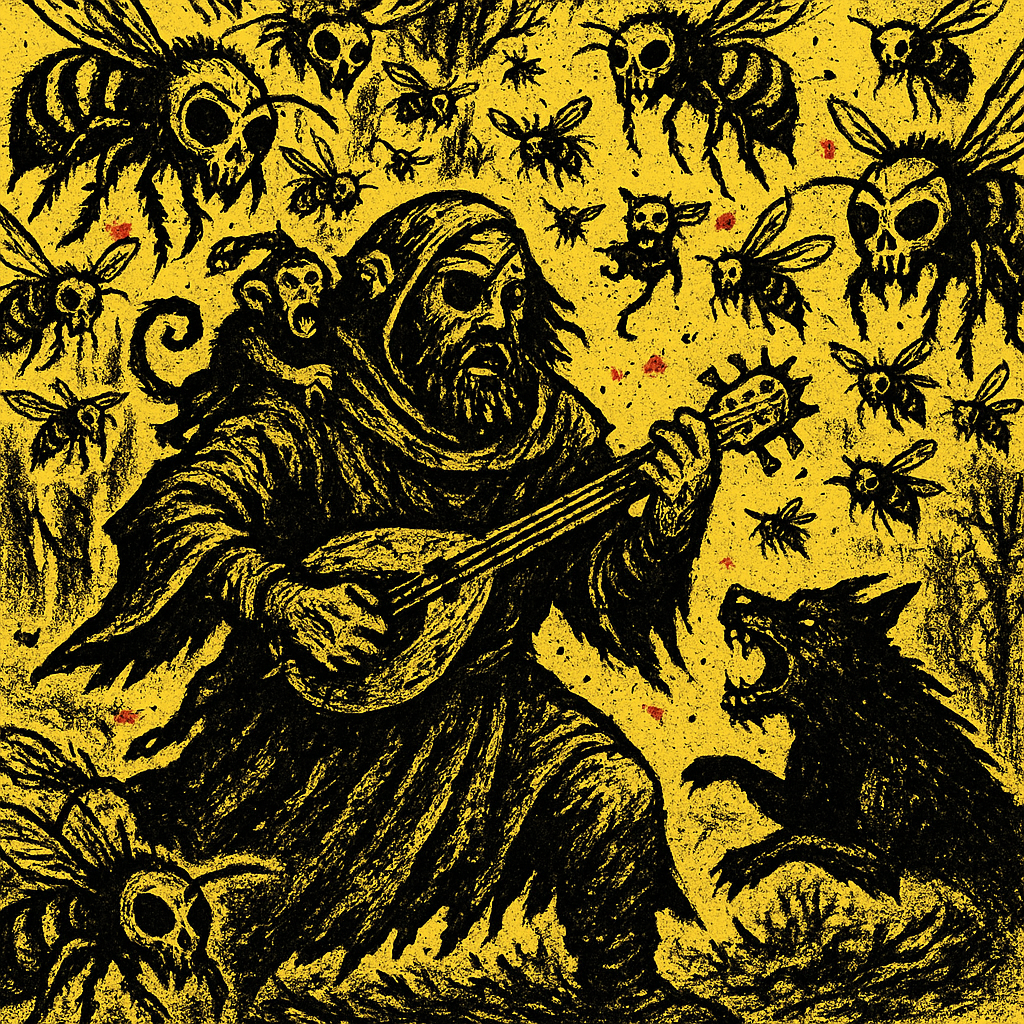 After gorging beside the Butcher’s wagon, the SCVM endured a cat-sized carrion-bee onslaught, scorched their hive to seize bone-marrow honey from a titan’s carcass, accidentally kindled the forest, and trudged south toward a blighted chapel to seek ember fungus.